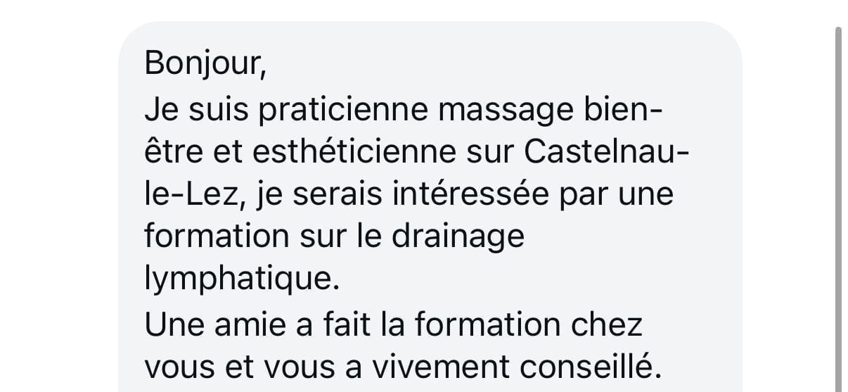 Que vous soyez novice dans le domaine du drainage lymphatique ou que vous souhaitiez approfondir vos connaissances, notre formation est ouverte à tous les niveaux. Nos cours sont adaptés à chaque individu pour garantir une progression personnalisée. Avec cette formation, vous aurez accès pendant 6 mois aux supports de cours ainsi qu'à Roxane P. en cas de besoin.